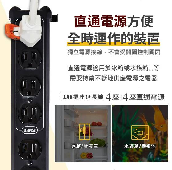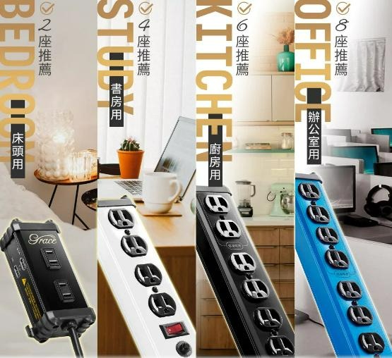 3孔8座UL防火美式插座/延長線。 獨家不導電全鋁合金機身。 高纖防火PVC端蓋。